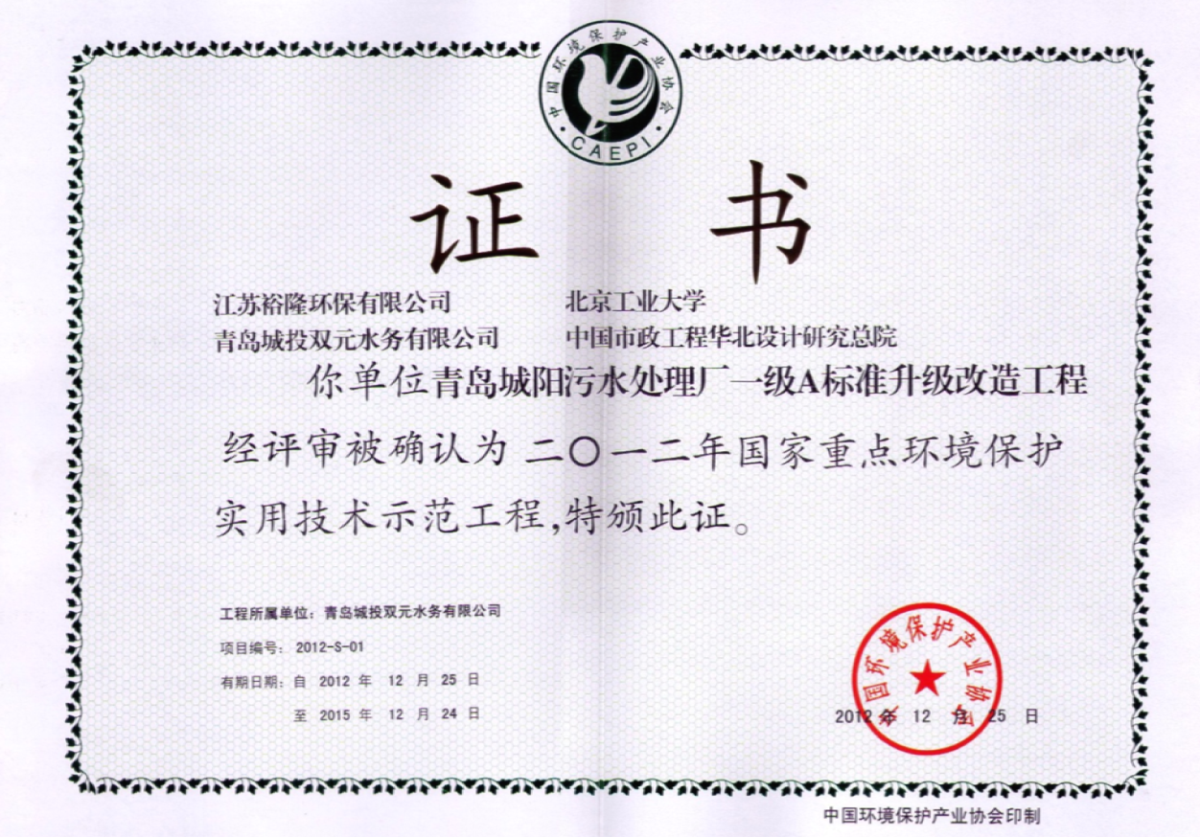 项目概况:青岛市城阳污水处理厂二期工程处理规模为5万吨/天,厂主要接纳白沙河北岸区域的工业和生活废水,工业水占60%,市政水40%。原处理工艺出水执行二级排放标准,难以实现新的环保要求。我司通过将原A2O工艺改造为分段进水AO工艺,并对好氧区利用好氧ISBAS工艺包进行升级改造,再不增加池容的基础上成功将出水提升至一级A排放标准。经过几年的运行,成功在好氧区实现短程硝化-厌氧氨氧化,出水总氮降至5mg/L,实现深度脱氮,且无需投加外碳源。目前该项目获得国内首个MBBR国家示范工程。