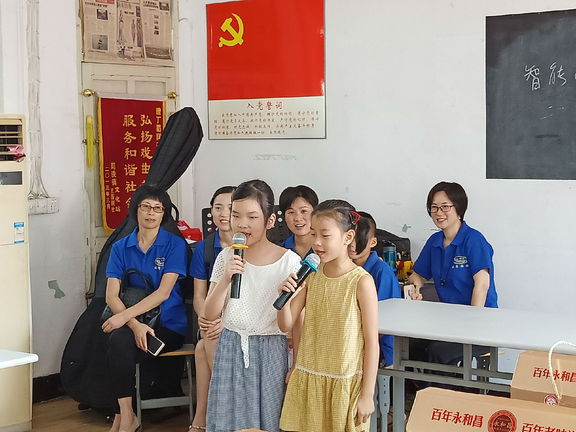 图为裕隆环保员工的小家属们为老人们表演节目